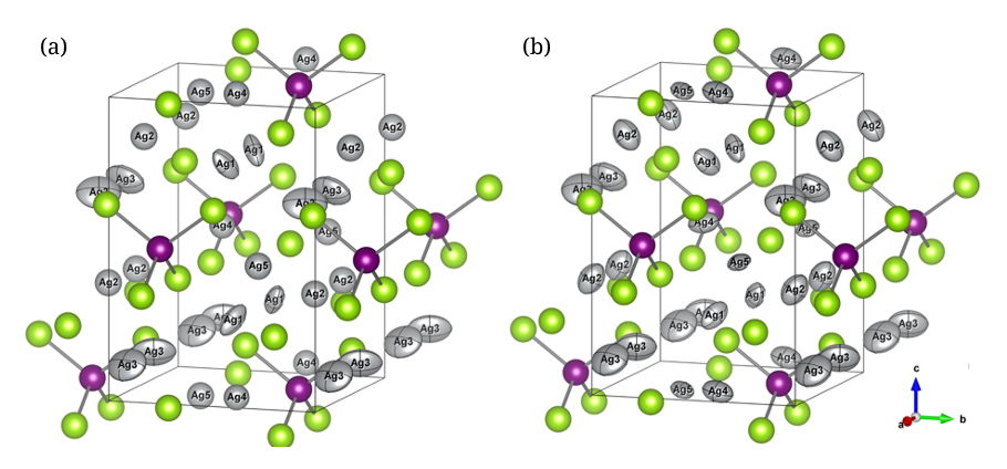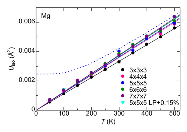 For MgO, the calculated ADP exhibited an almost linear dependence on temperature. When corrected for quantum mechanical effects (dashed line), the room-temperature result of 0.0042 Ų showed good agreement with the experimental value from X-ray diffraction (XRD) of 0.0038 – 0.0040 Ų [2] (Fig. 1). In Ag₈SnSe₆, the large anisotropy and "rattling" behavior of the Ag atoms were successfully reproduced, suggesting the possibility of site splitting (Fig. 2). At 300 K, U3/U1(the ratios of the major to minor semi-axes of the displacement ellipsoid) for the highly anisotropic Ag3 and Ag1 sites showed relative errors of -15.8% and -17.6%, respectively, against the experiment. The isotropic ADP Uiso, representing the overall magnitude of the displacement ellipsoid, showed relative errors of -5% and -12% (Table 1).The paper [1] also presented results for other thermoelectric materials.