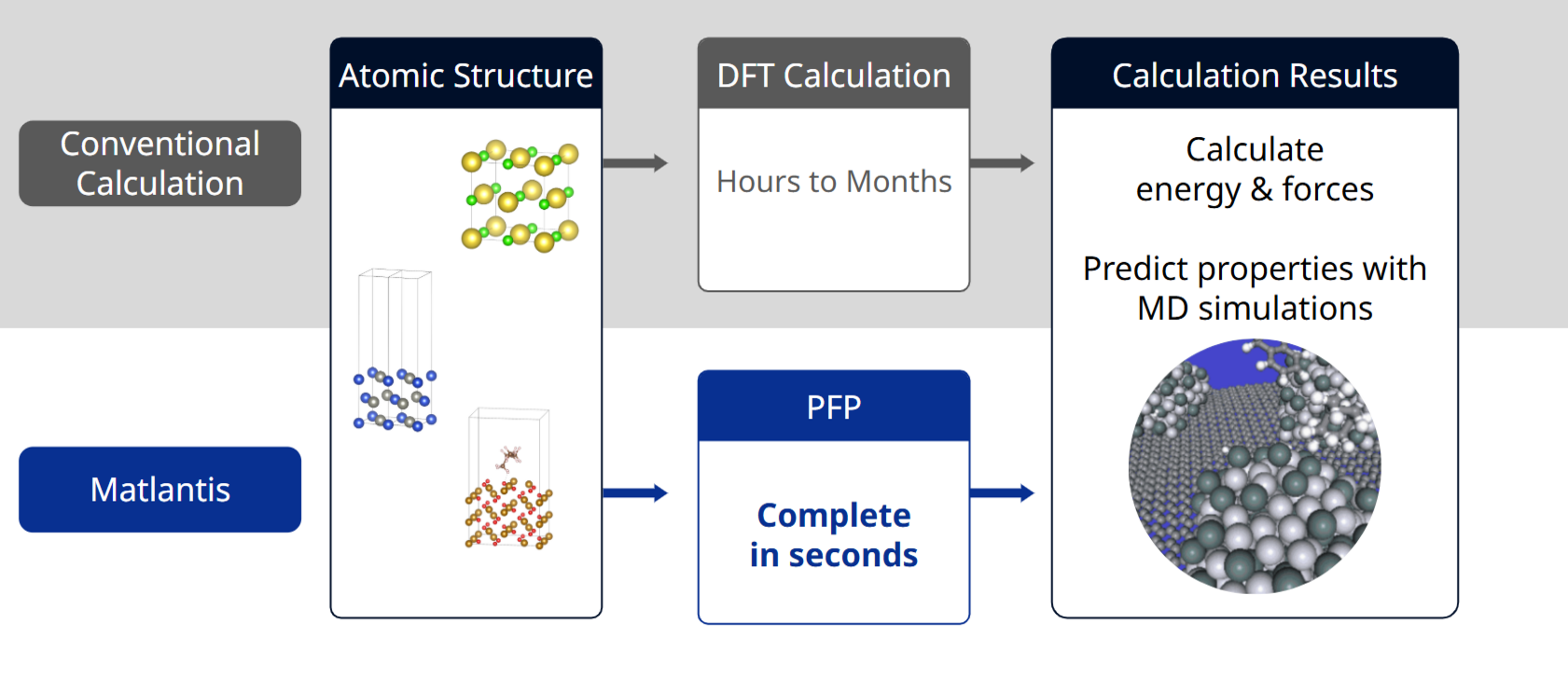 By pairing the high-performance AI model PFP with the purpose-built PFVM engine, Matlantis delivers a simulation environment with speed and scalability unmatched by conventional approaches.