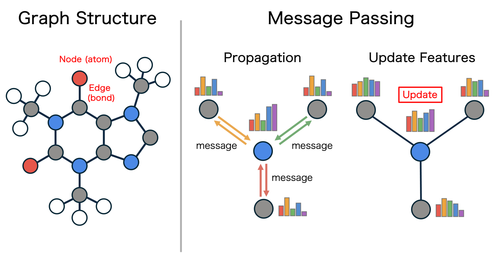 Figure 3: Graph representation of a molecule and the Message Passing mechanism