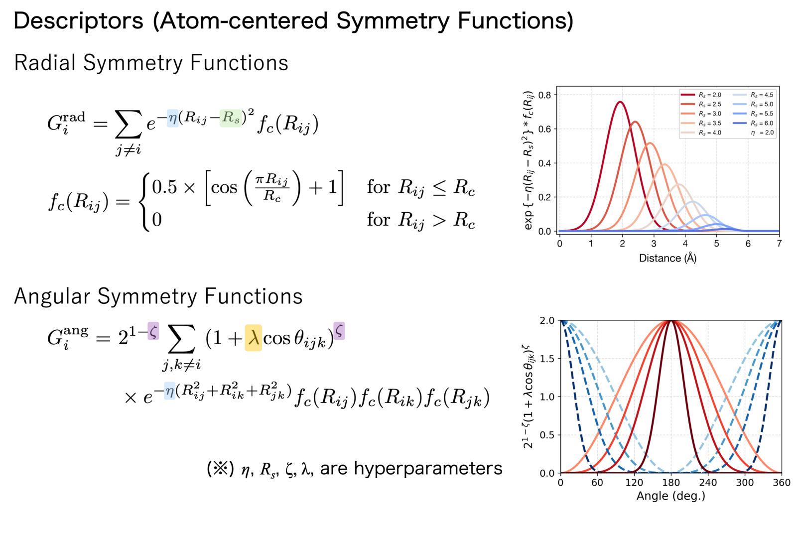 A pioneering study in this field is the Behler-Parrinello Neural Network proposed by Behler and Parrinello in 2007[1]. They employed Atom-Centered Symmetry Functions (ACSF) as descriptors, which express relative information such as interatomic distances and bond angles using Gaussian functions.