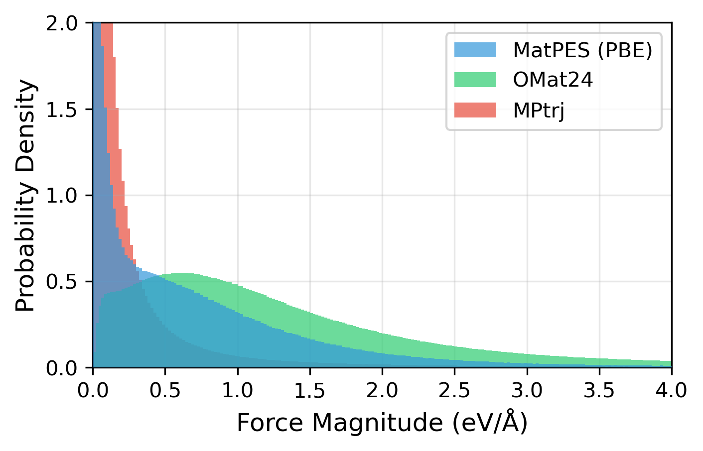Figure 5: Distribution of structures and forces contained in MatPES (PBE)[6],OMat24[7],MPtrj[8] datasets. While OMat24 is dominated by data in regions with large forces far from equilibrium, MPtrj is concentrated in regions with small forces near equilibrium. MatPES is characterized by balanced coverage of both regions. The figure is created by the author based on Fig. 2 of Kaplan (2025) Fig2.