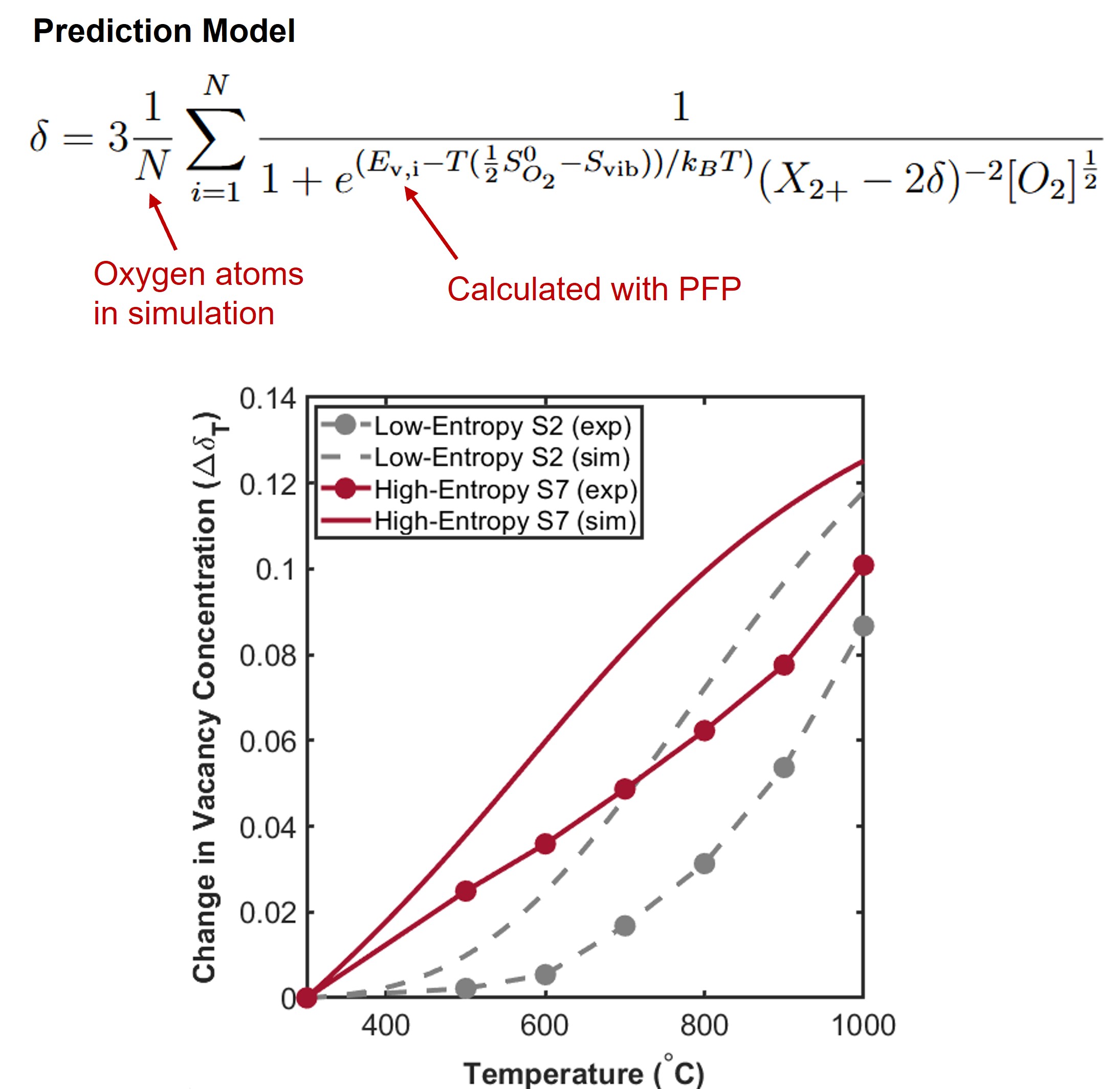 Using this model, simulations were able to predict relative differences in vacancy concentrations (Δ𝛿 𝑇 ) over a wide temperature range between a low-entropy and high-entropy oxide. This can guide the design of new electrode materials for SOEs.