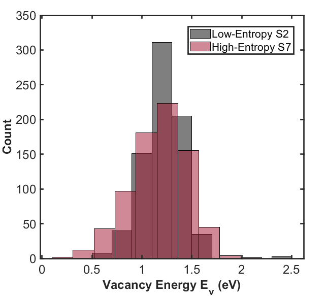 In each material, the oxygen vacancy energy is calculated for each of the N=768 oxygen sites by removing the oxygen and relaxing positions. The results is a distribution of vacancy energies for each material.