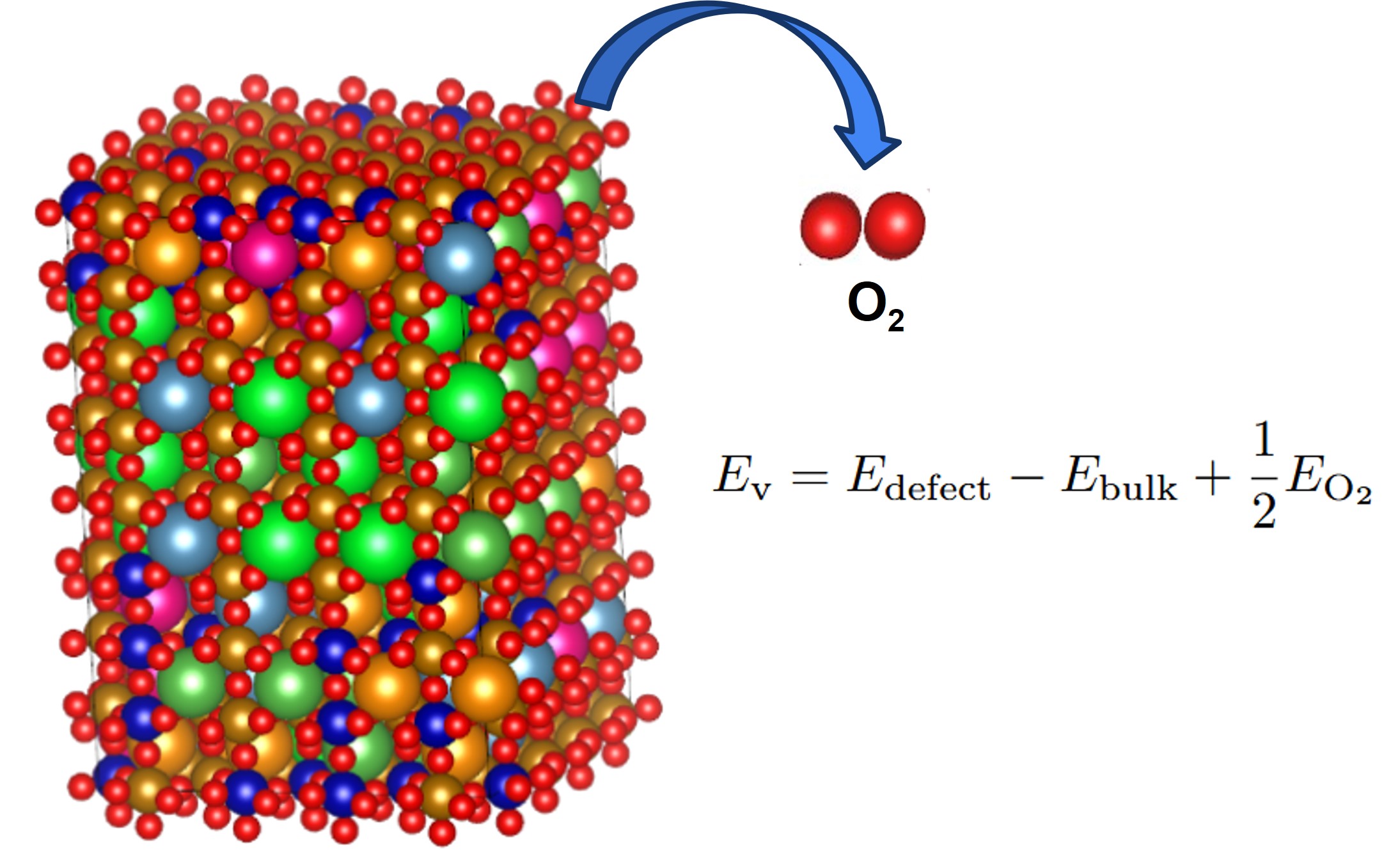 Traditionally, studies calculate a single value for the oxygen vacancy formation, but this study argues complex materials require a statistical averaging over all possible oxygen sites. The distribution of vacancy energy for two materials is shown including their average (