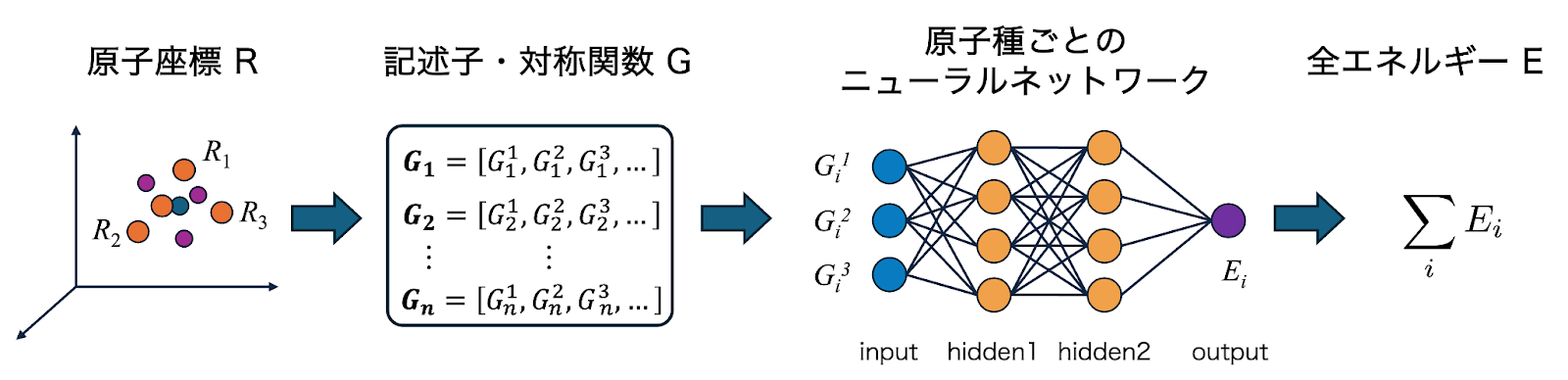 この分野でのパイオニア研究として知られるのが、2007年にBehlerとParrinelloが提唱したBehler-Parrinello Neural Network です[1]。 彼らは、原子のデカルト座標ではなく、原子間距離や結合角度といった相対的な情報をガウス関数などで表現する原子中心対称関数 (Atom-Centered Symmetry Functions: ACSF) を記述子として採用しました。
