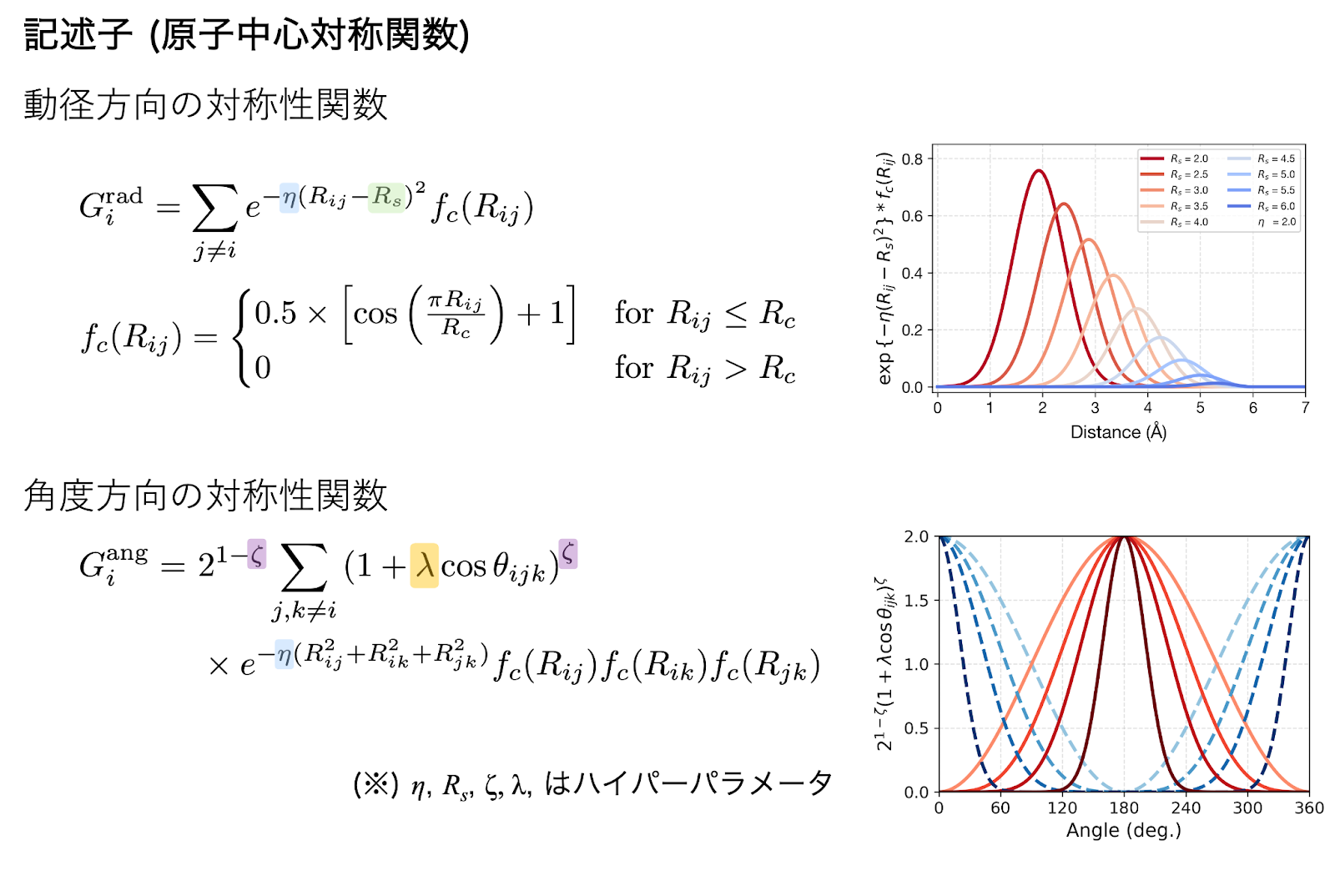 図2: Behler-Parrinello型ニューラルネットワークポテンシャルに使われる記述子関数