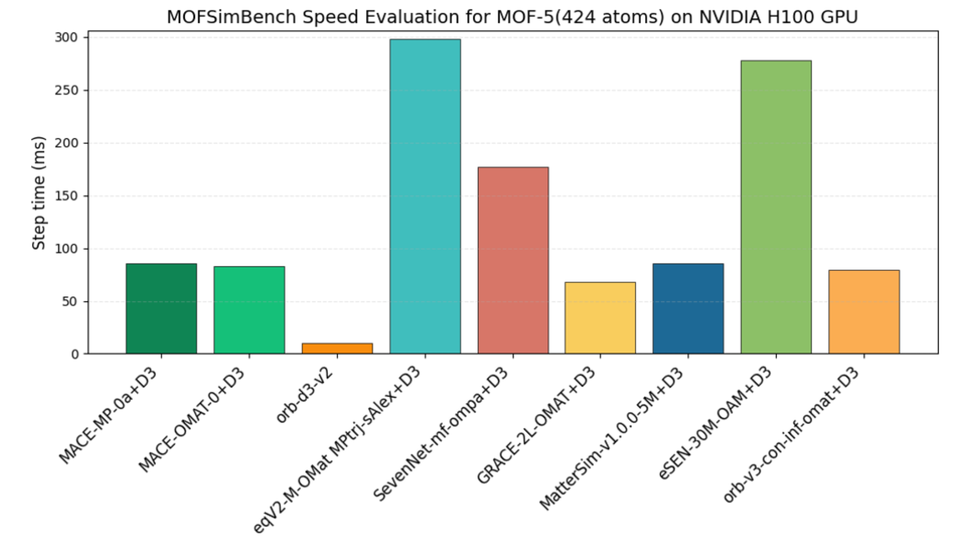 図9. 文献[1]で報告されている主要な汎用MLIPの計算速度比較。MOF-5 (424原子) を対象として1000 stepの構造最適化を行い、1 stepあたりの平均的な推論速度を算出。