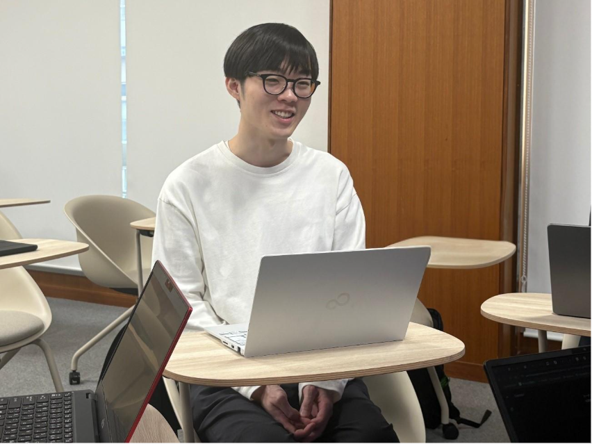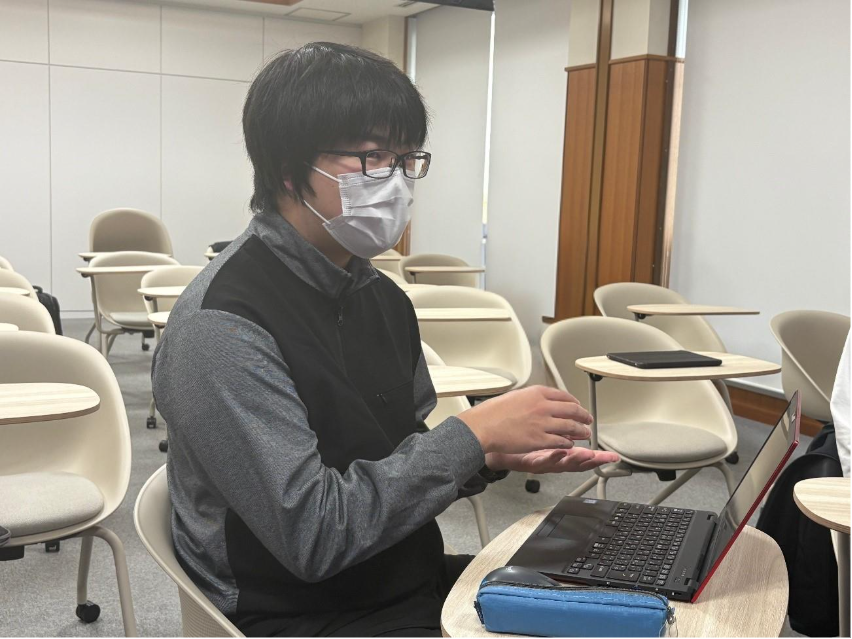 プレゼン終了後、最先端理工学実験の受講者である細川三四郎さん、山口大翔さんのお2人に話を聞くことができました。実験系の研究室に所属する細川さんは、計算やシミュレーションの経験はほぼゼロで、当初は強い苦手意識を持っていましたが、今回の授業を経てその意識は大きく変化しました。